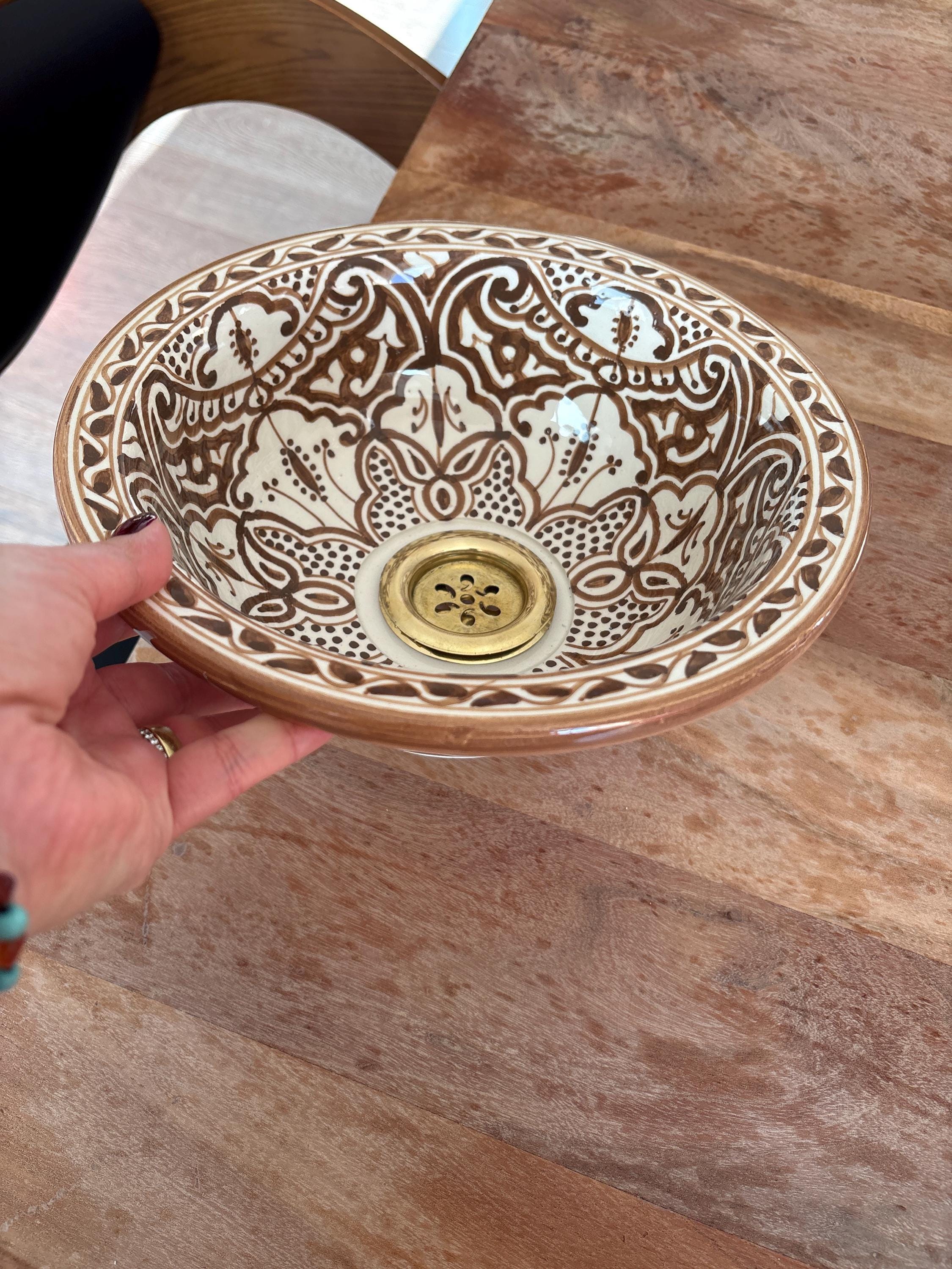 Keywords: Moroccan Tile Sink, Andalusian Bathroom Style, Interior Design, Handmade Pottery Washbasin, Antique Sink, Home Decor, Middle Age Porceline,Real Traditional Tile, Indoor Design, Renovation ideas, Marble Design, Luxury Sink, Decor Inspiration, sink vanity, sink bowl, sink vessel, pottery handmade, pottery handmade sink, pottery handmade large sink, pottery handmade large sink,**Please note for the no US customers : you may pay the custom fees when the product arrives we suggest you check that first.Please note that some products have a brass rim and it's known that the authentic brass get green with time and especially if you live near the ocean, it can be cleaned with the natural cleaners.